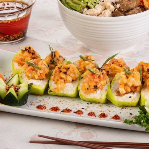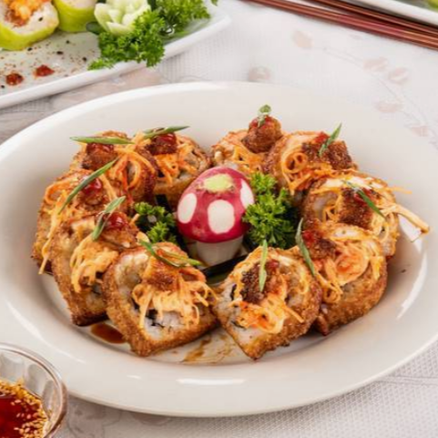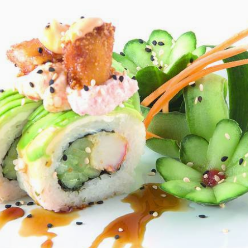 Por dentro pepino y aguacate, por fuera philadelphia envuelto en surimi, con empanizado y topping de ensalada kani, masago y cebolla, coronado con camarón empanizado, salsa de anguila y sriracha, sushi de 10 pzas.