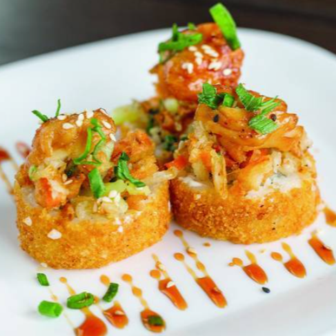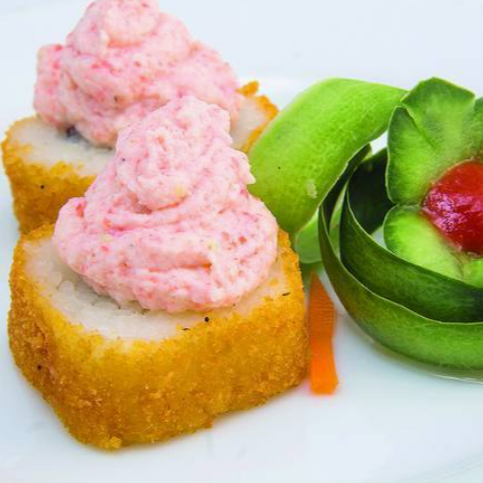 Rollo empanizado, por dentro alga nori, pepino, aguacate y surimi, por fuera queso philadelphia y coronado con ensalada de camarón con aderezo spicy.