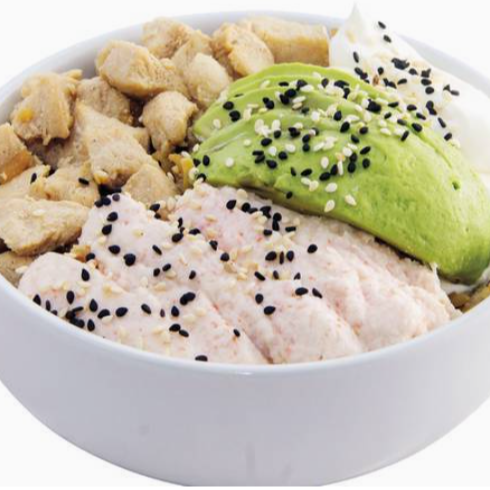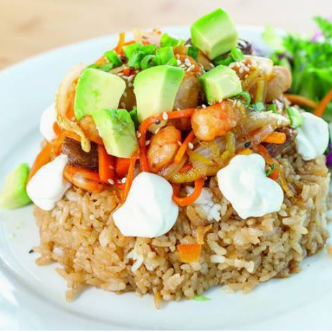 Arroz frito acompañado con calabaza, zanahoria y cebolla en juliana, arrachera, pollo y camarón, bañados con salsa teriyaki, coronado con aguacate y queso philadelphia.