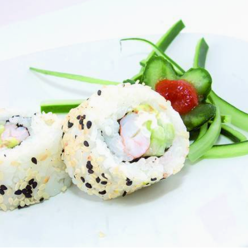 10 pzas De rollo, por dentro: alga nori, queso philadelphia, aguacate, pepino y camarón o surimi, por fuera: ensalada tampico.