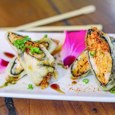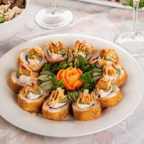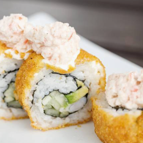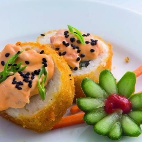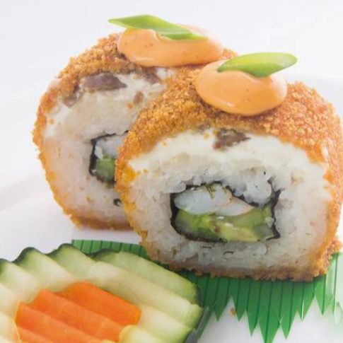 10 pzas De sushi, rollo empanizado, por dentro alga nori, camarón, pepino y aguacate; por fuera queso philadelphia y ensalada tampico.