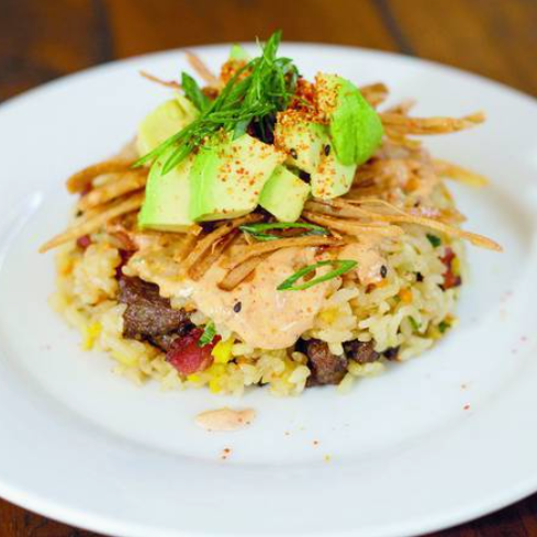 Arroz frito acompañado de carne arrachera y camarón crujiente, brócoli y julianas de tortilla tostada, acompañado con aguacate y cebollín.