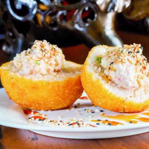 2 pzas De bolas de arroz empanizadas, rellenas de aguacate, queso philadelphia y camarón, con topping de tampico y salsa de anguila, 4 mitades.