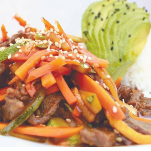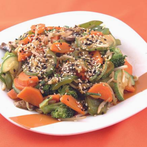 Deliciosa combinación de zanahoria, calabaza, cebolla, pimiento morrón, brócoli, champiñón y germen de soya, acompañado de carne de selección.