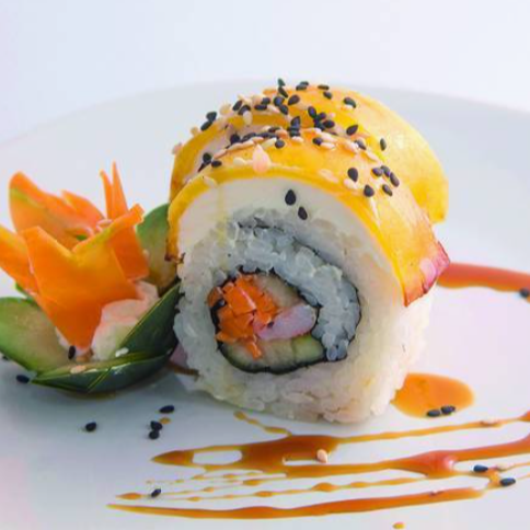10 pzas De rollo, por dentro: alga nori, queso philadelphia y aguacate, por fuera: empanizado y coronado con gratinado de pollo teriyaki, julianas de wonton doradas y ajonjolí.