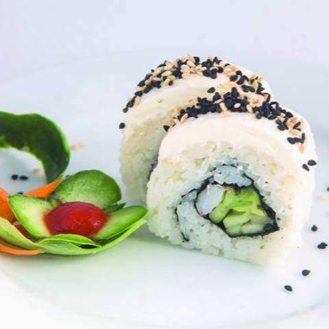 10 pzas De rollo, por dentro: alga nori aguacate, pepino, camarón o surimi, por fuera: queso philadelphia y ajonjolí.