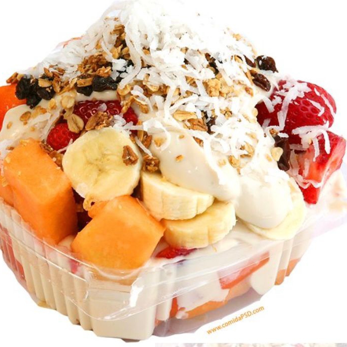 Fruta picada con yogurt o crema preparada y topping