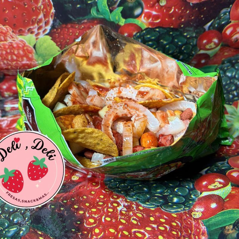 Tostitos , con jícama , pepino , cuerito , salchicha, cacahuate ,dulcesitos de tamarindo , limón y salsas