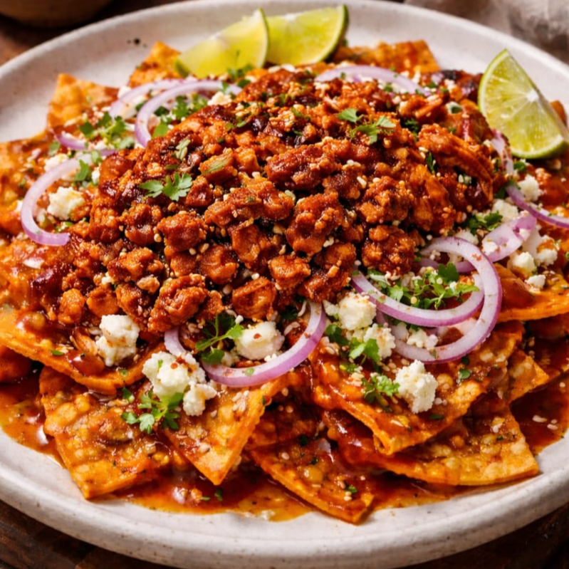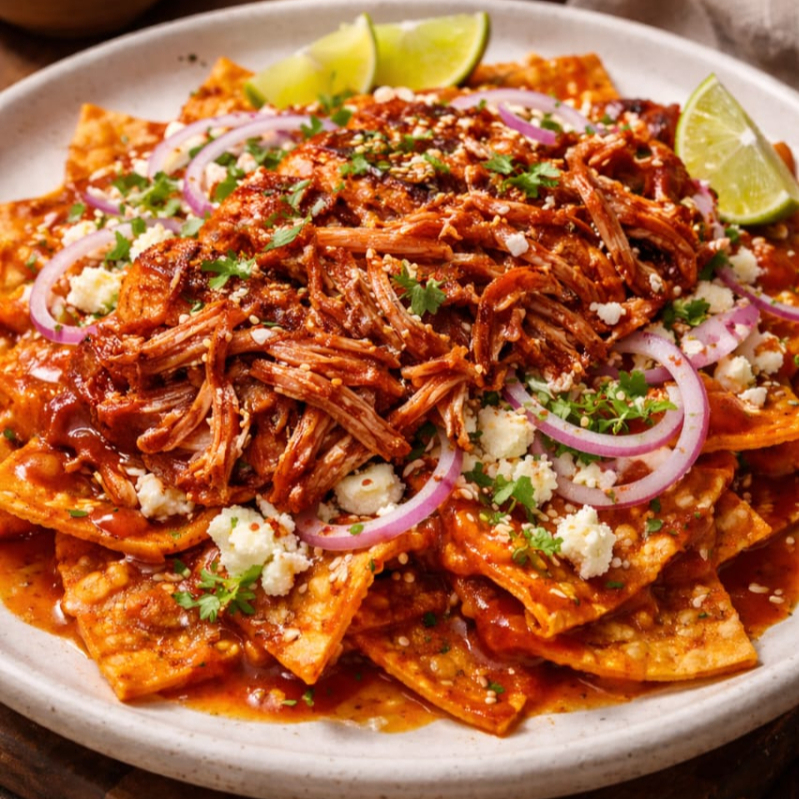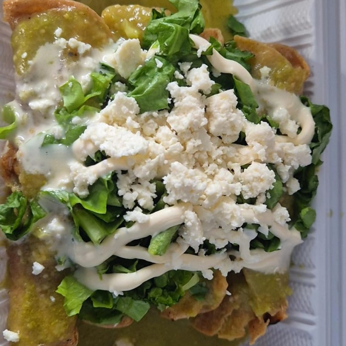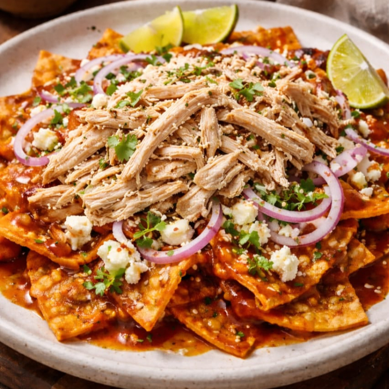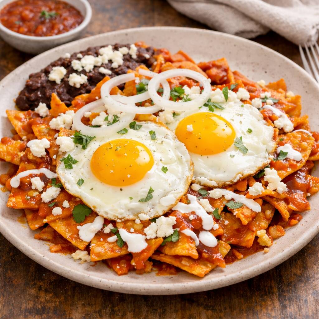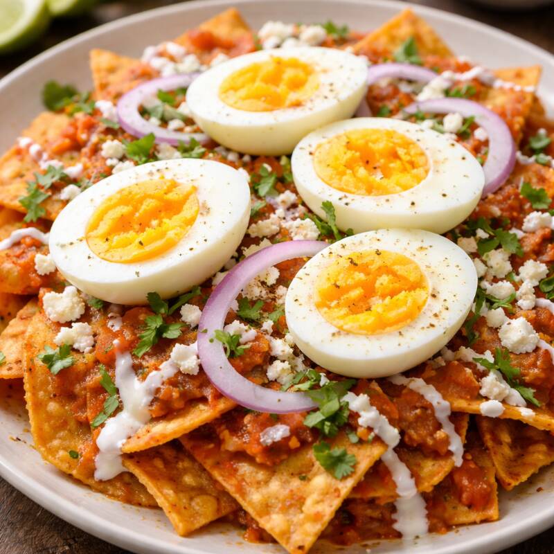 tortilla frita revuelta en huevo, bañado en salsa roja o verde, decorada con queso, crema, cebolla y coronado con huevo cocido