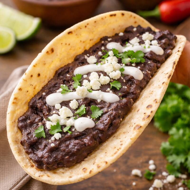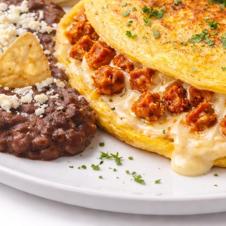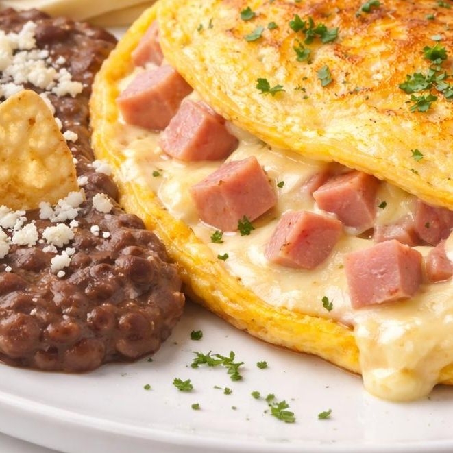huevo batido, relleno de jamón y queso acompañado de frijoles fritos