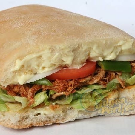 3 tapas de pan blanco, Pollos deshebrado, mayonesa, lechuga, jitomate, cebolla y jalapeño, acompañado con papas.