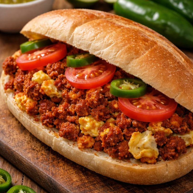 bolillo, huevo, longaniza, frijoles, cebolla y serrano