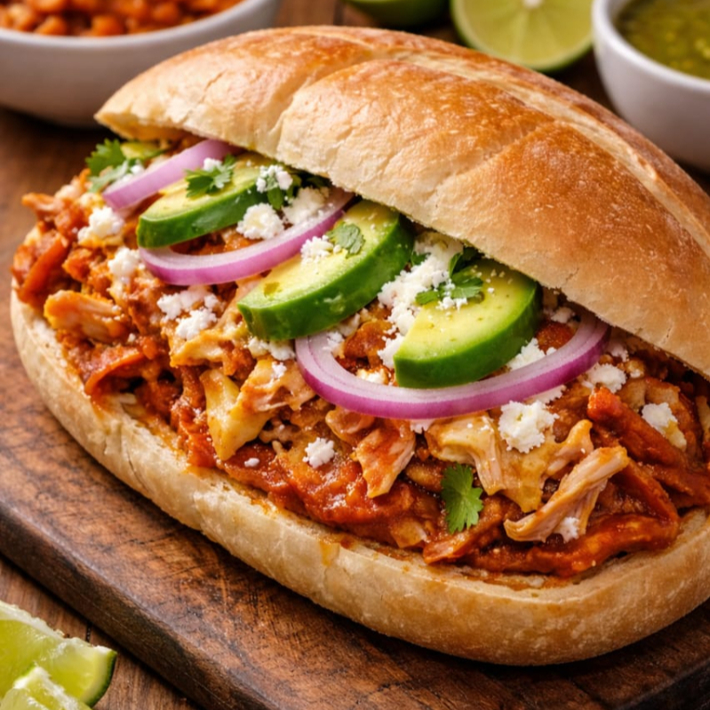 bolillo relleno de chilaquiles colimotes, queso, crema y cebolla