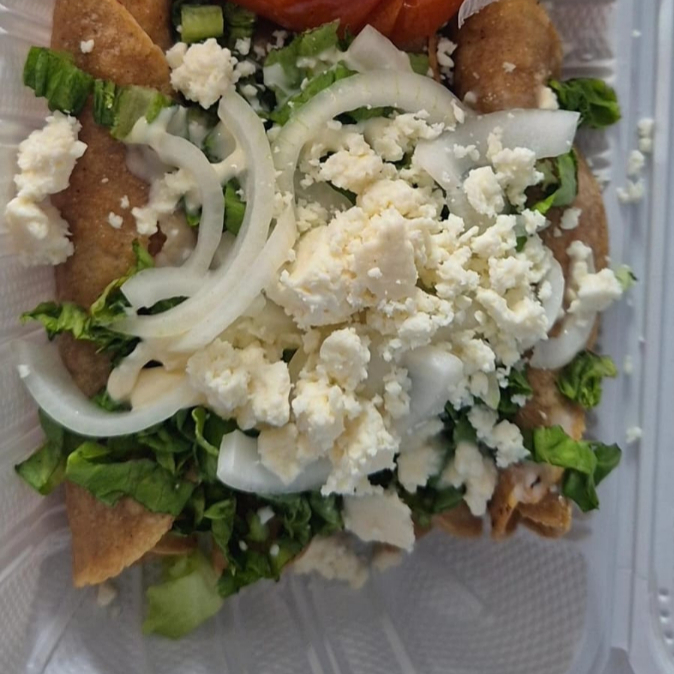 4pz de flautas de pollo, acompañada con lechuga, crema, queso y una salsita de jitomate para bañarlas