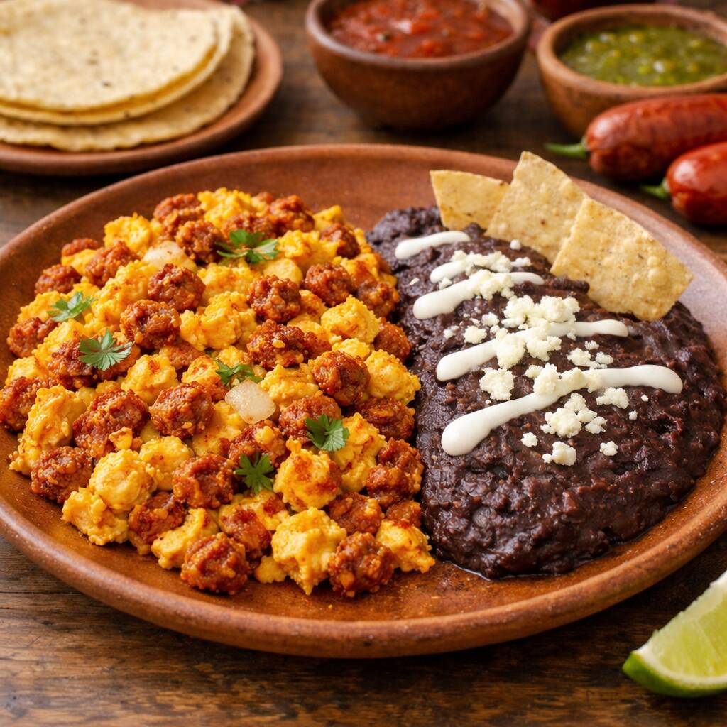 huevo revuelto con longaniza, acompañado de frijoles fritos