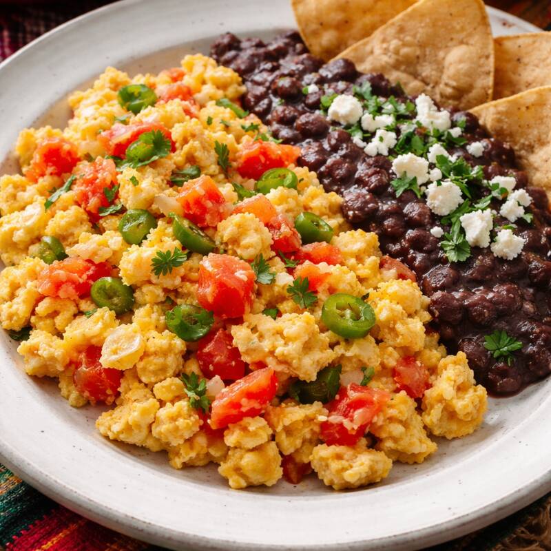 huevo revuelto con jitomate, cebolla y chile acompañado de frijoles fritos y tortilla