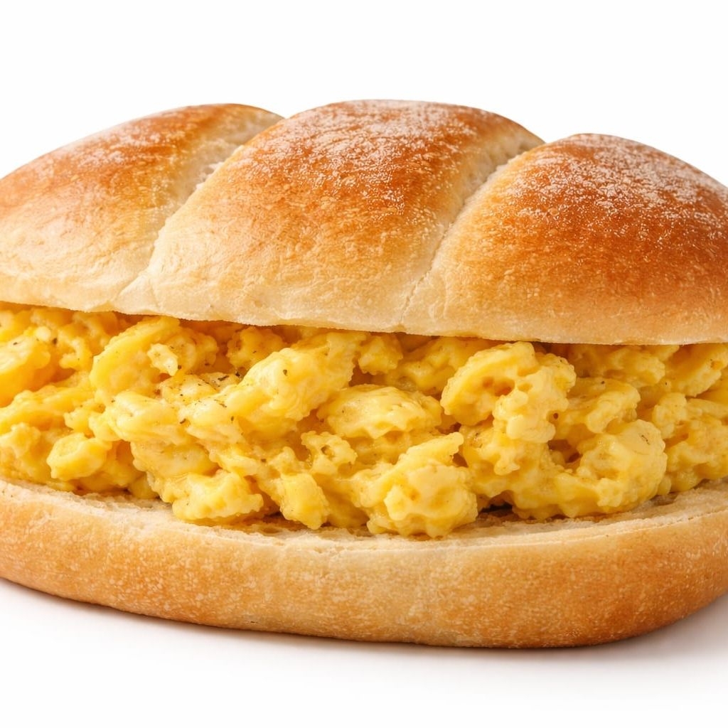 3 tapas de pan blanco, Huevo revuelto con jamo, Mayonesa, jitomate, cebolla y jalapeño, acompañado con papas.
