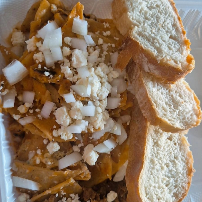 tortilla frita revuelta en huevo, bañado en salsa roja o verde, decorada con queso, crema, cebolla y coronado con 2 huevos estrellados bien cocidos