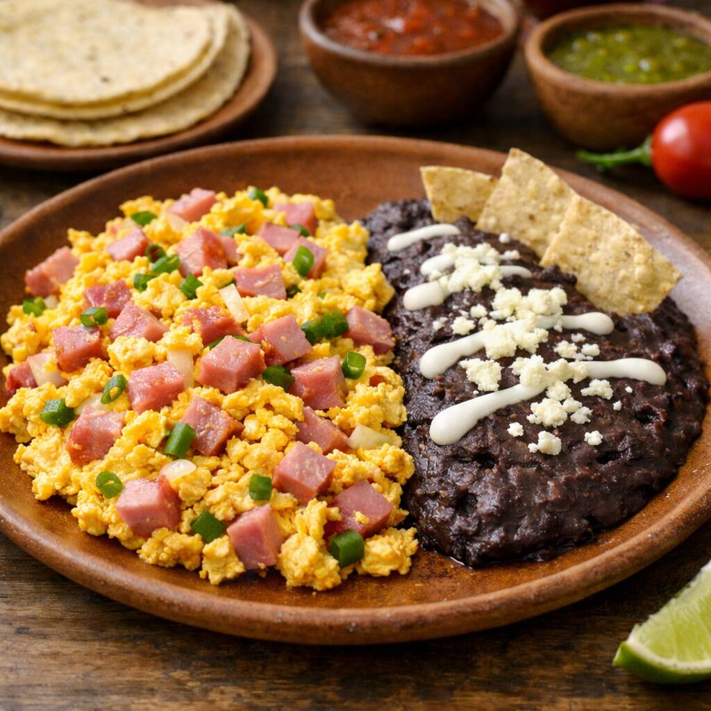 Huevito revuelto con jamón acompañado de frijoles fritos y tortillas