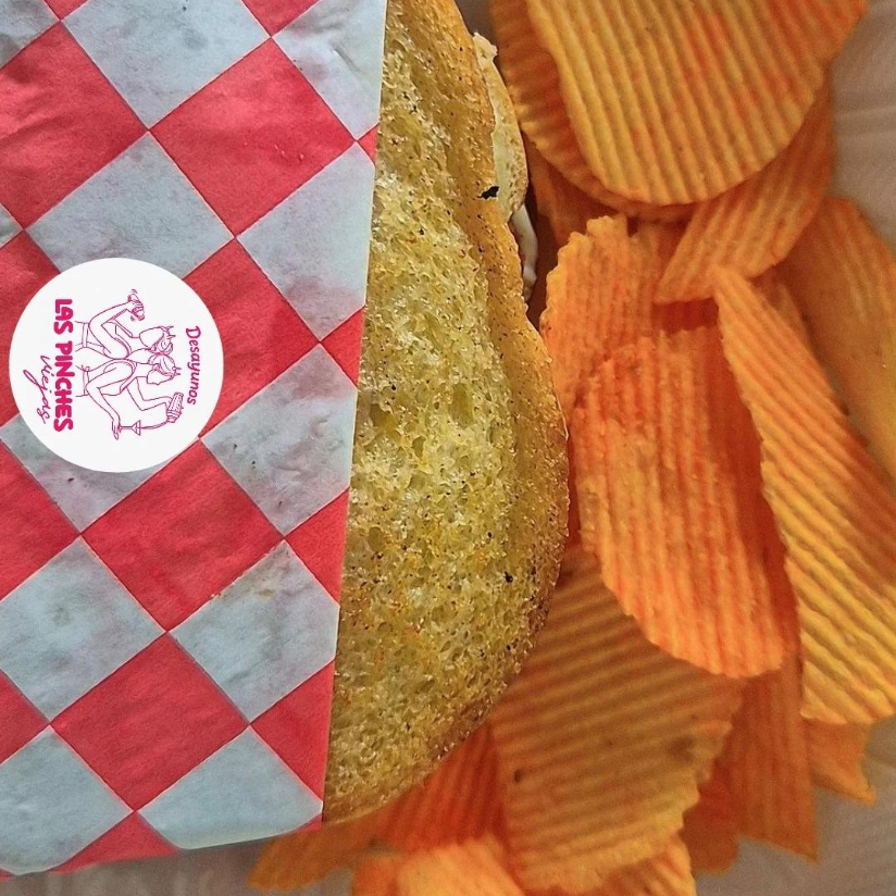 3 tapas de pan blanco, Panela, mayonesa, lechuga, jitomate, cebolla y jalapeño, acompañado con papas.