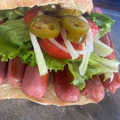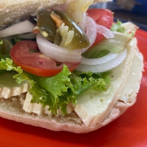 acompañada de jamon, lechuga, jitomate, cebolla y chiles en vinagre