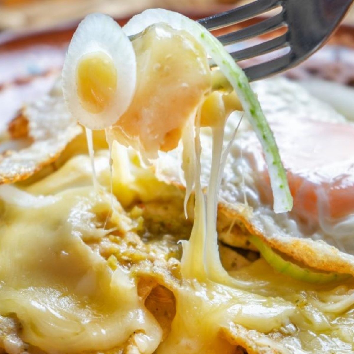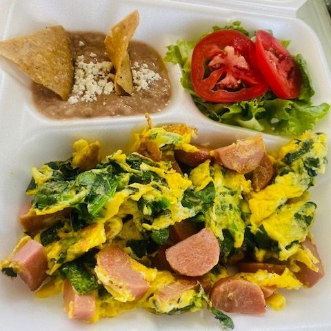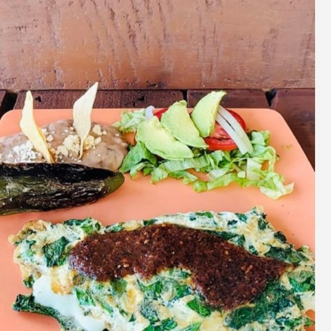 jitomate, cebolla, chile verde, queso, acompañados con frijoles fritos y ensalada