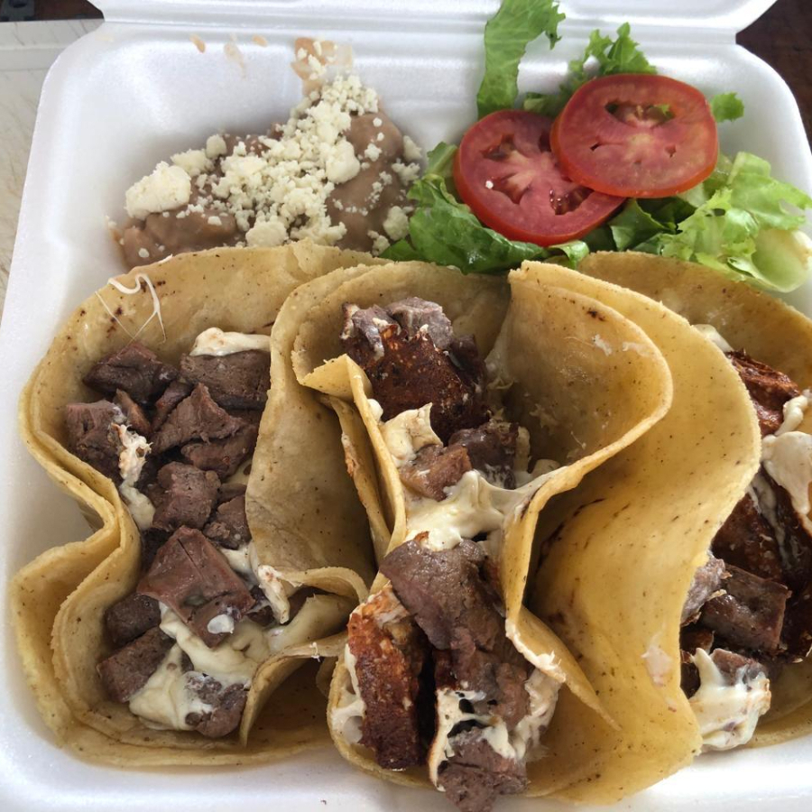 acompañado con frijoles fritos y ensalada (lechuga, jitomate y cebolla)
