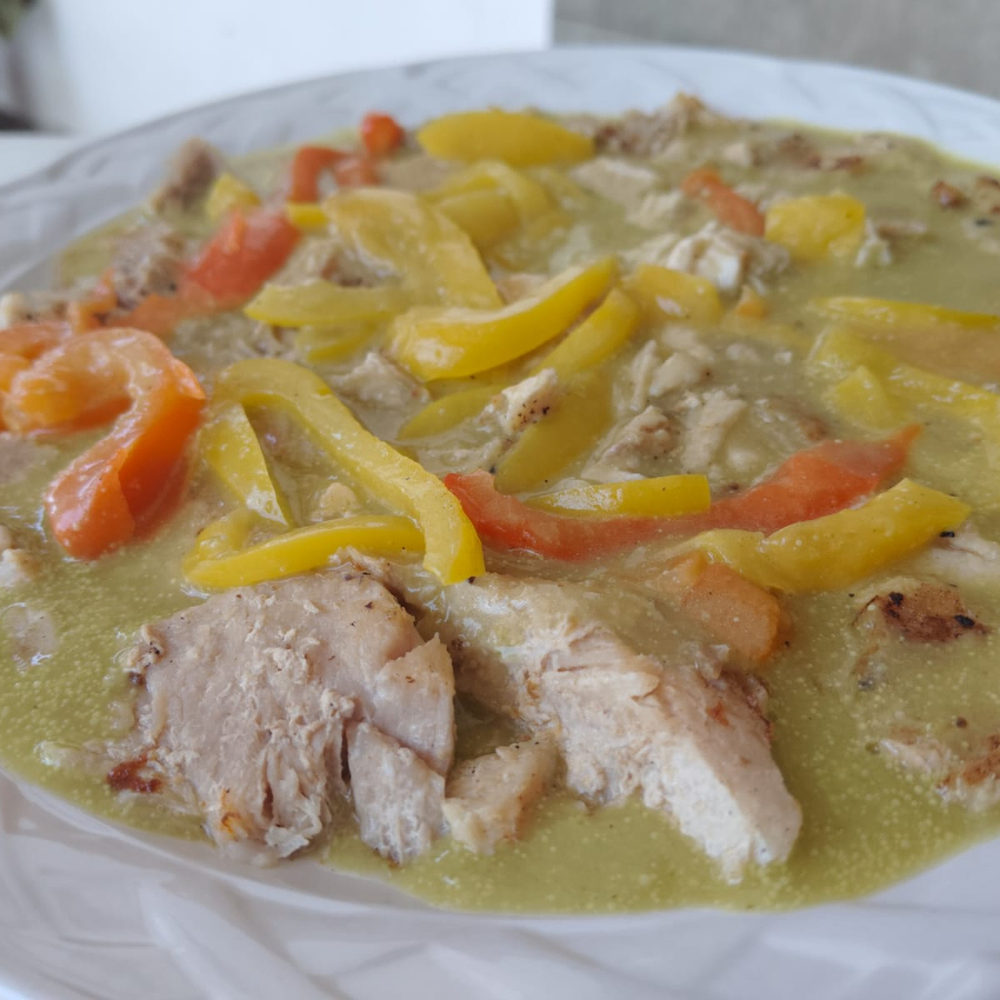 Lomo de cerdo con pimiento morrón en julianas bañado de crema de tomate (Tipo enchiladas suizas)