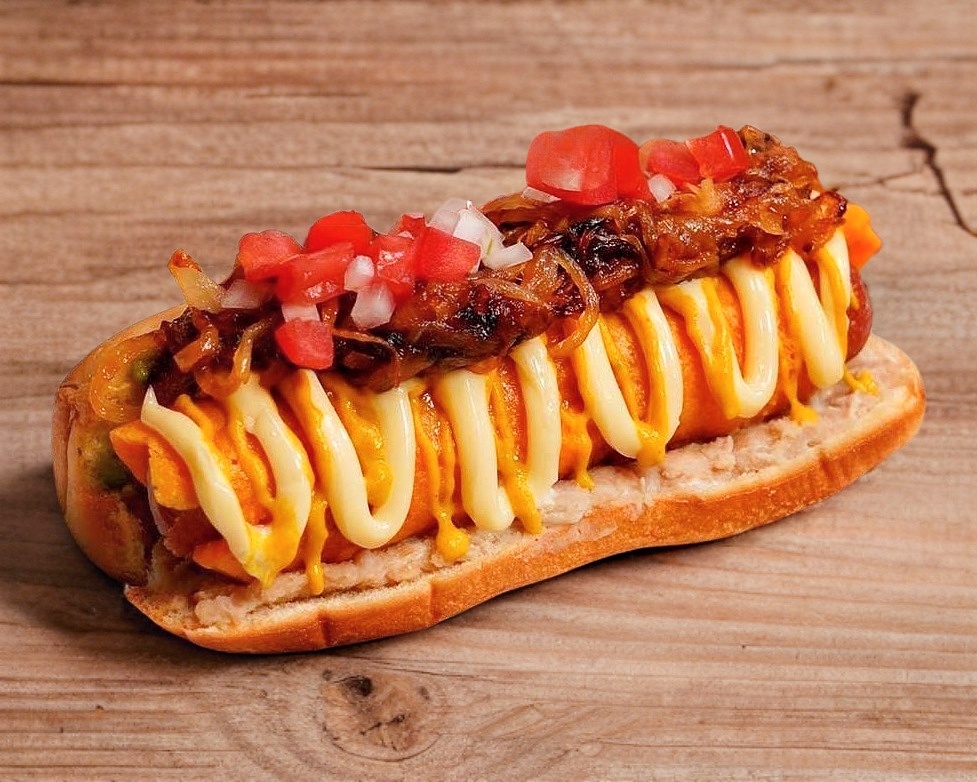 Salchicha de pavo extra larga, queso asadero, piña, longaniza, jitomate y cebolla.
