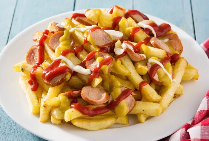 Papas a la francesa y salchicha cortada tipo pulpo.