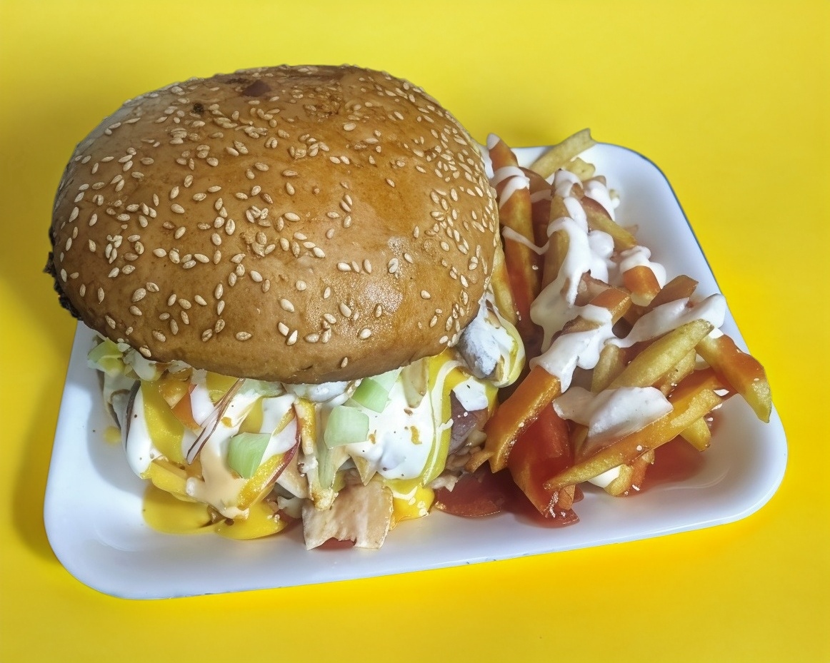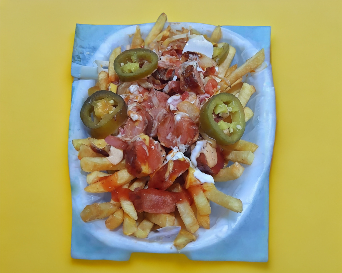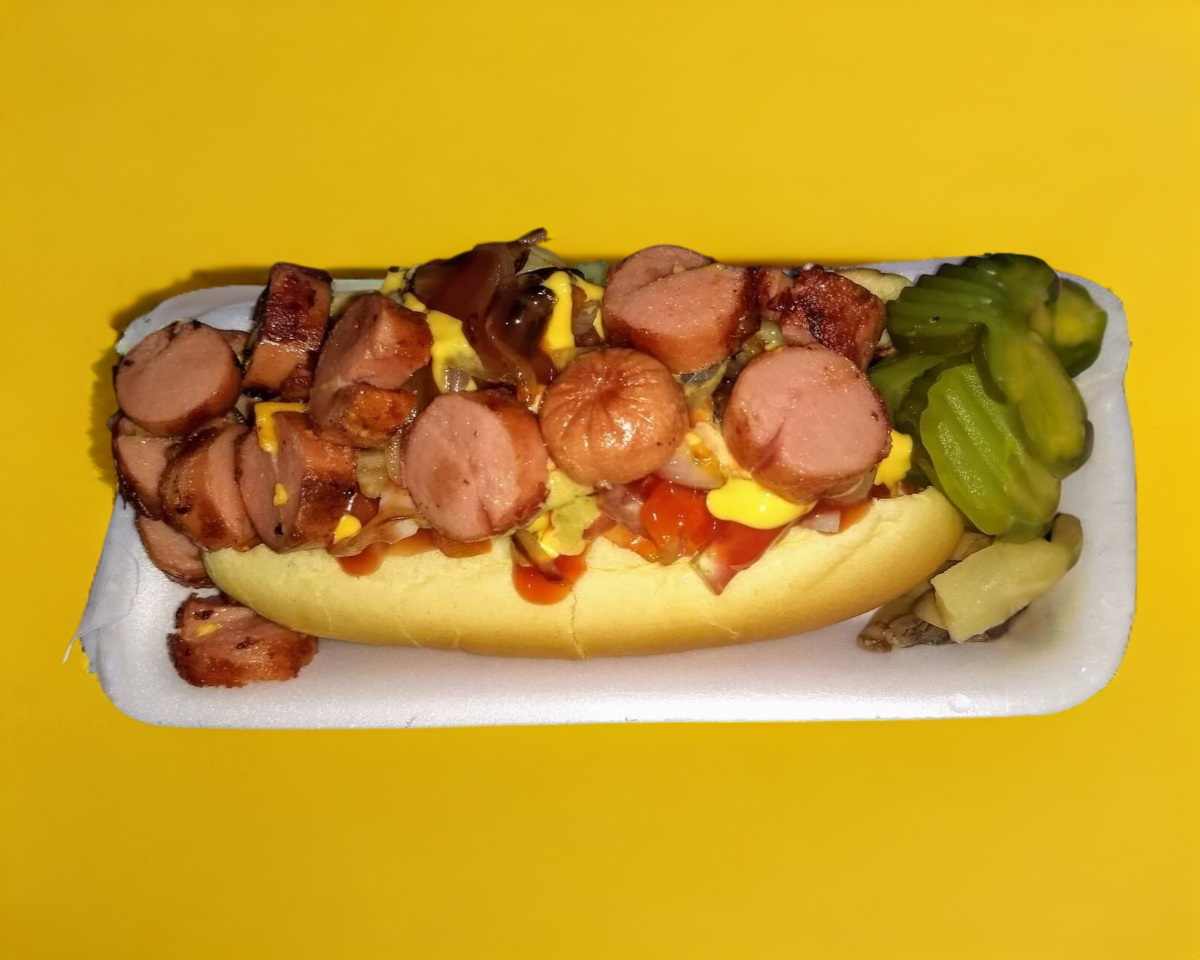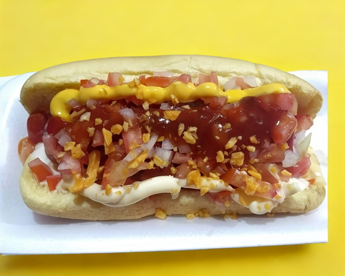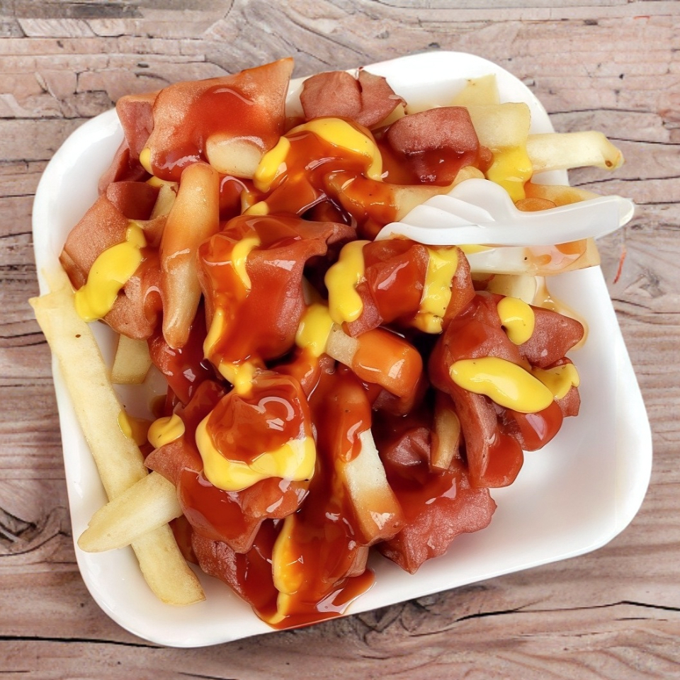 Papas a la francesa con 2 salchichas con queso amarillo, crujiente tocino y cebollita caramelizada.