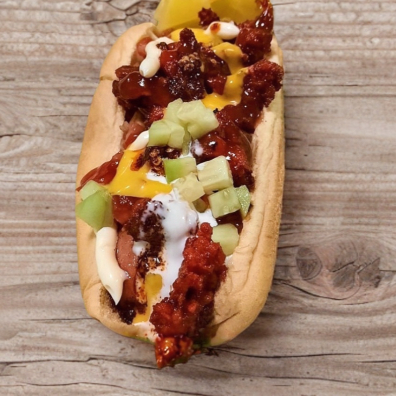 Dogo con Salchicha de pavo rellena de Philadelphia y un top de chilli. (Chili es un guisado e carnes picosito)