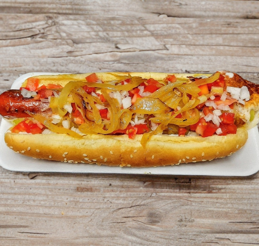 Riquisimo Dogo de Salchicha de res polaca de 23cm adentro de un chile wero relleno de queso oaxaqueño envuelto en tocino.