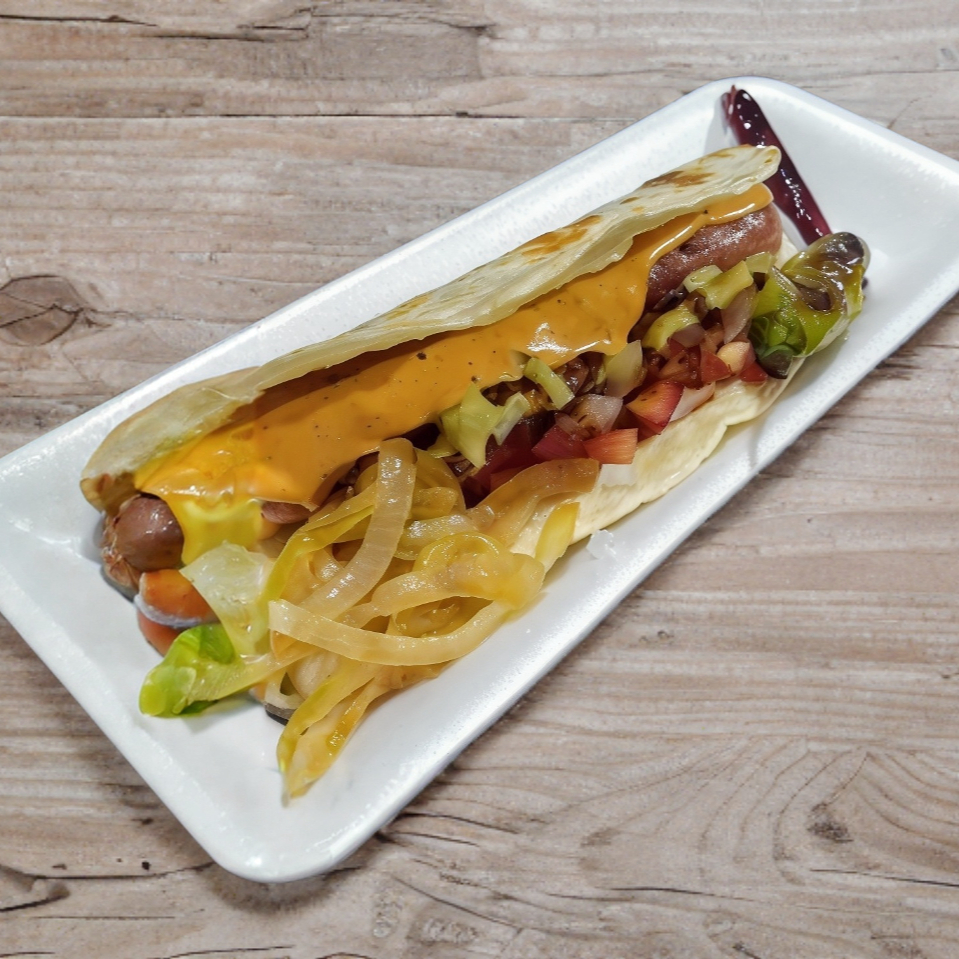 1 Dogo con Salchicha de pavo gourmet tipo polaca de 22cm, pan bimbo, rellena de queso asadero envuelto en crujiente tocino