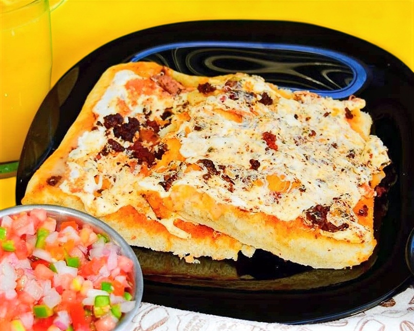 Telera con crema, frijoles, queso asadero y lomo adobado.