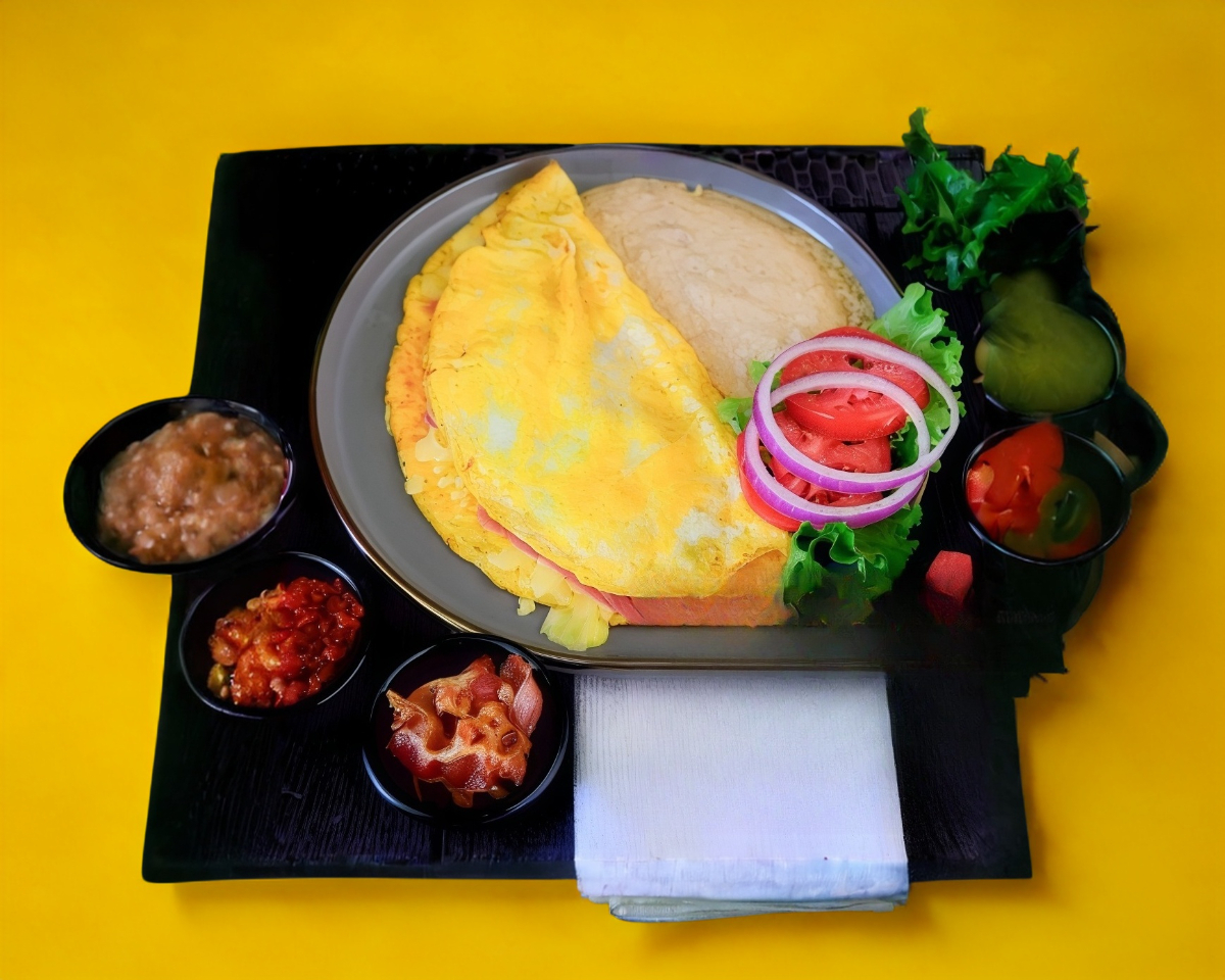 3 Huevos con queso asadero, ingrediente a elegir, frijoles y ensalada. Incluye frijoles, ensalada y 3 tortillas