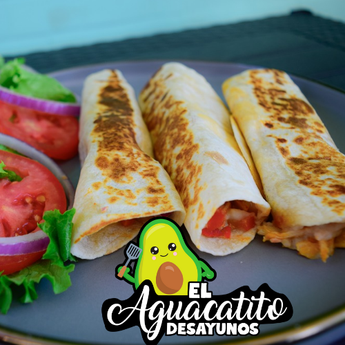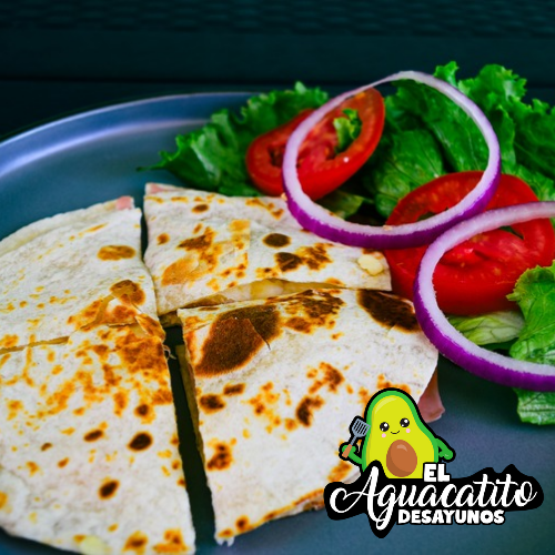 3 Piezas de tortilla de harina con queso asadero, lomo adobado, frijoles, jitomate, cebolla y chile verde.