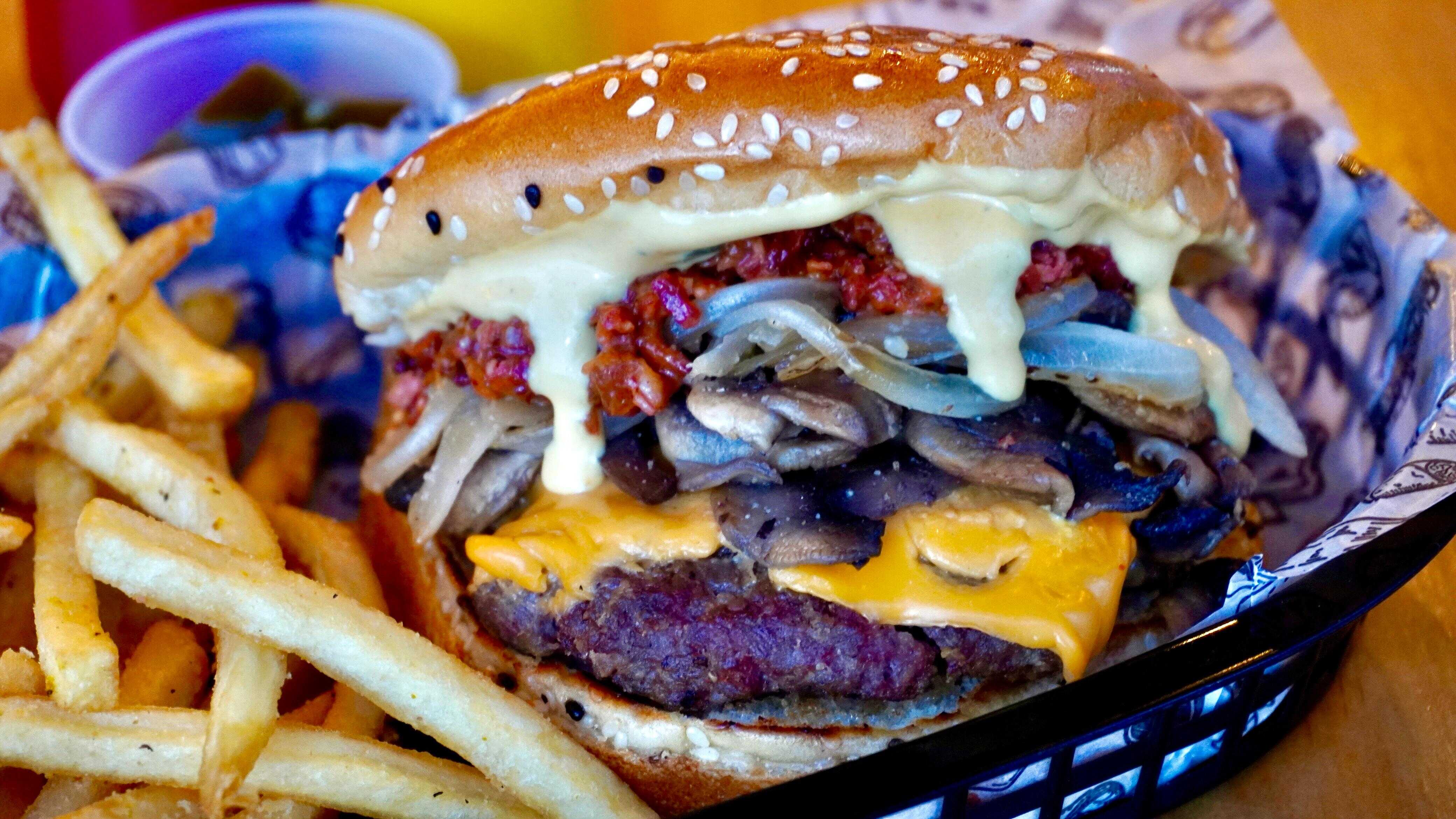 Carne de res con queso amarillo, champiñones, crujiente tocino y cebolla caramelizada.