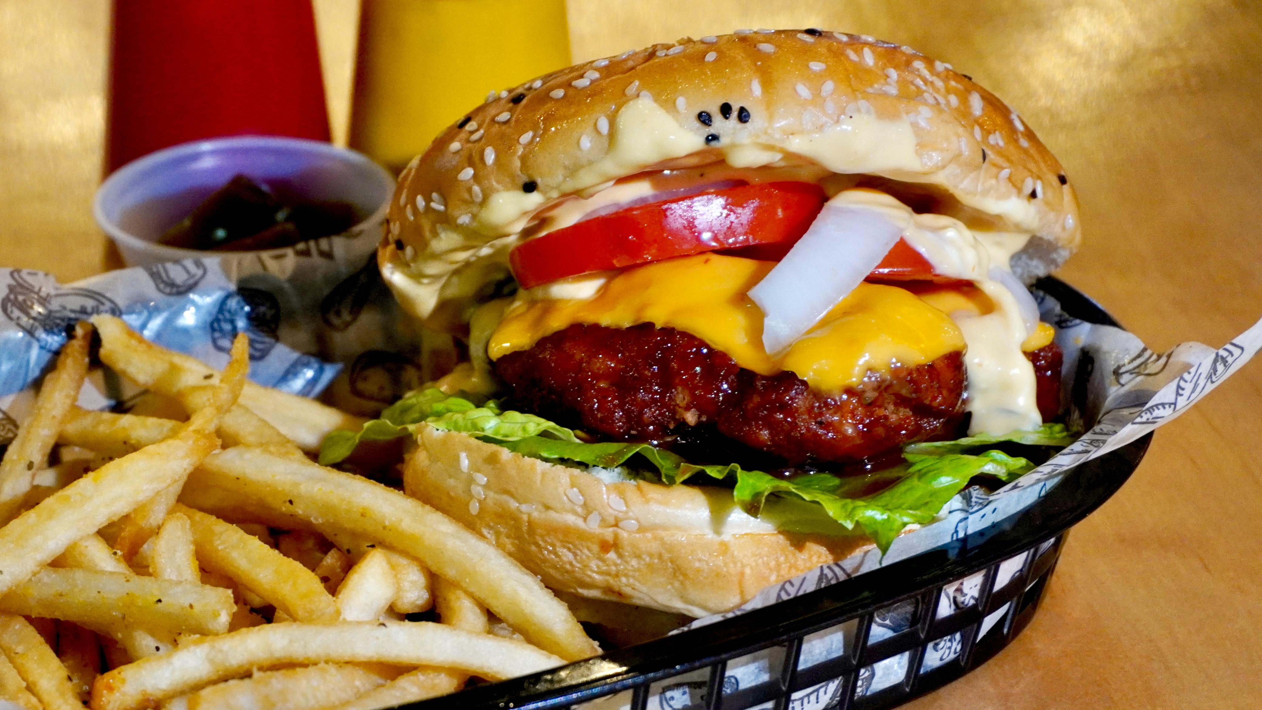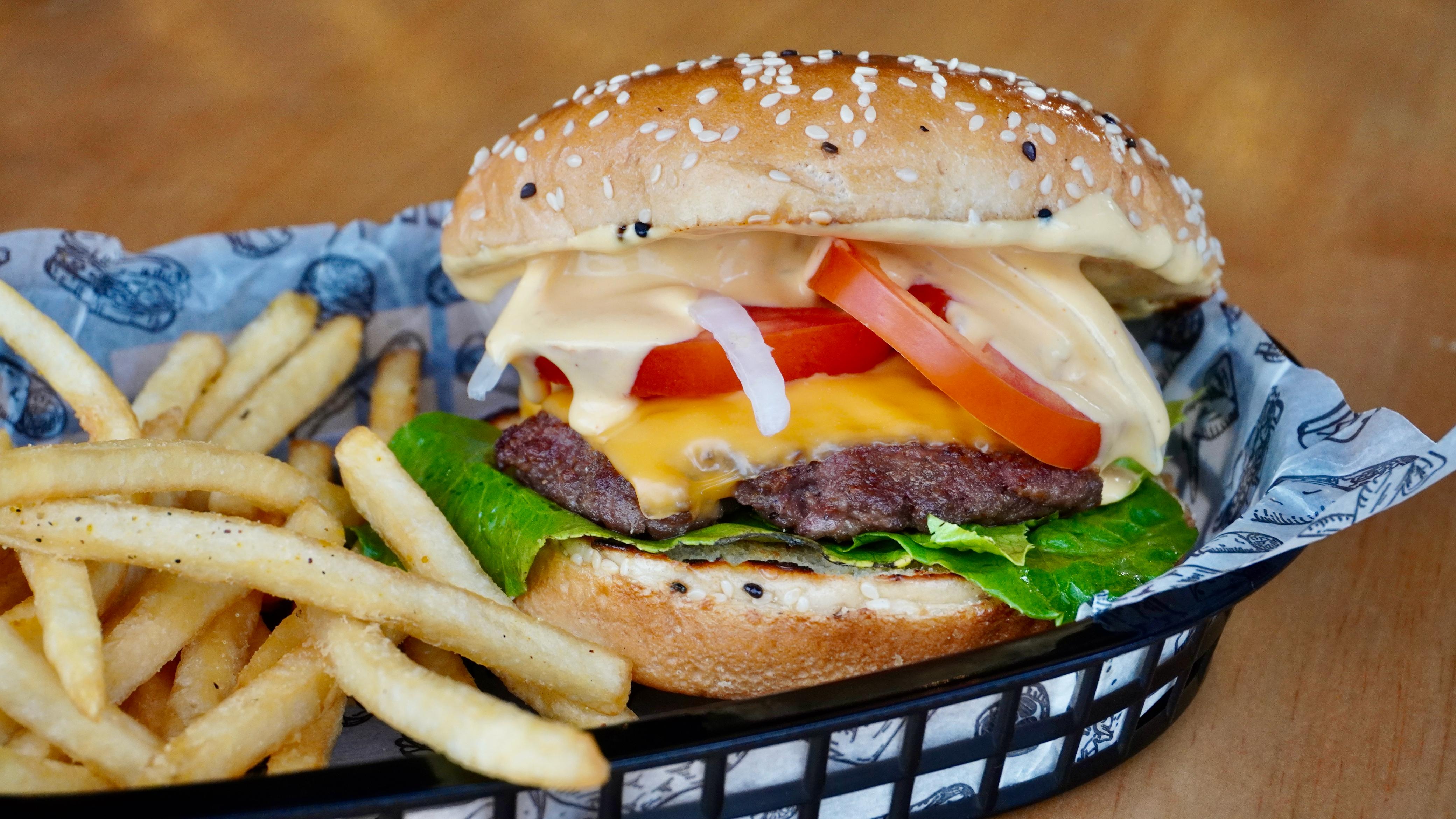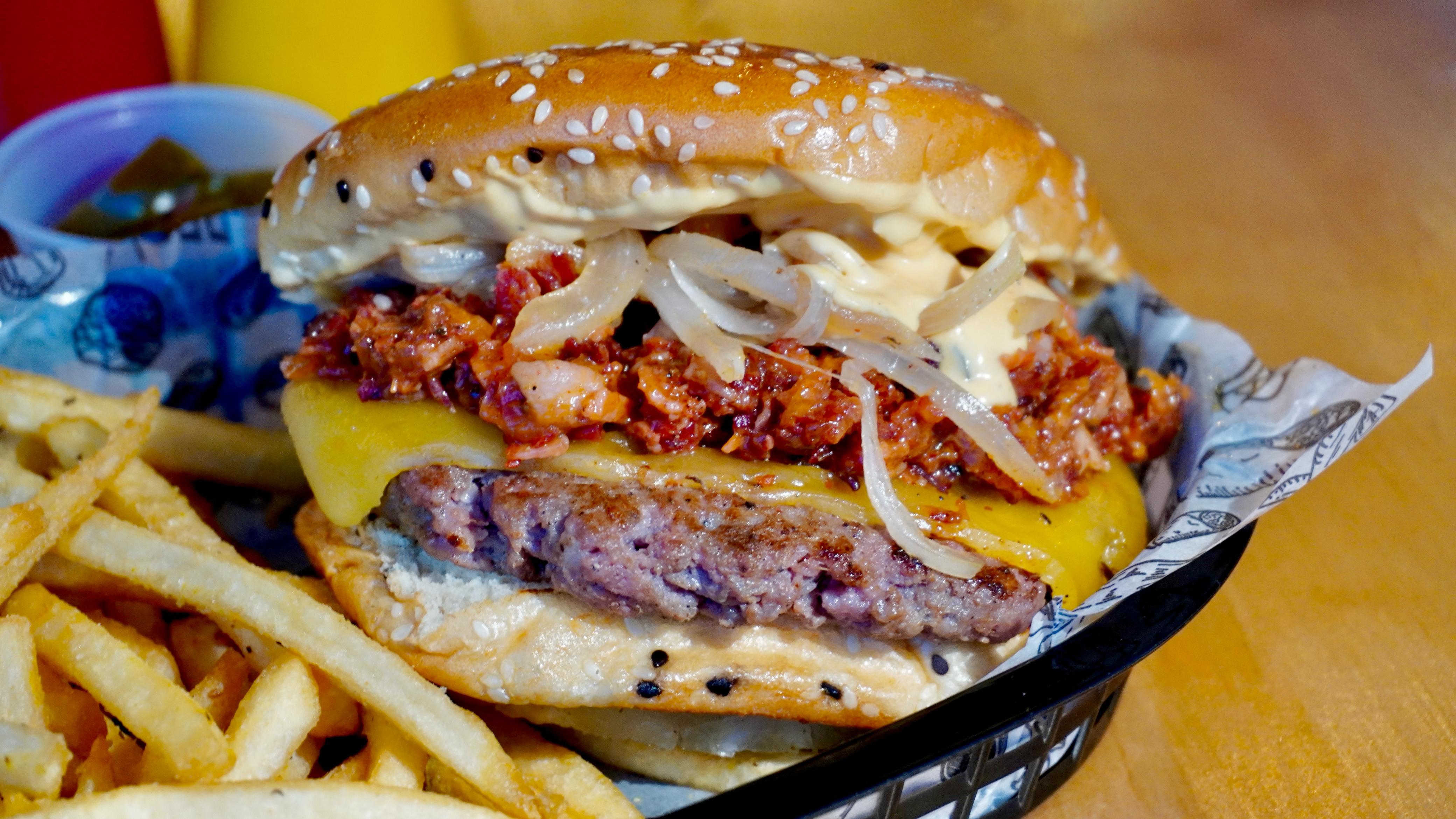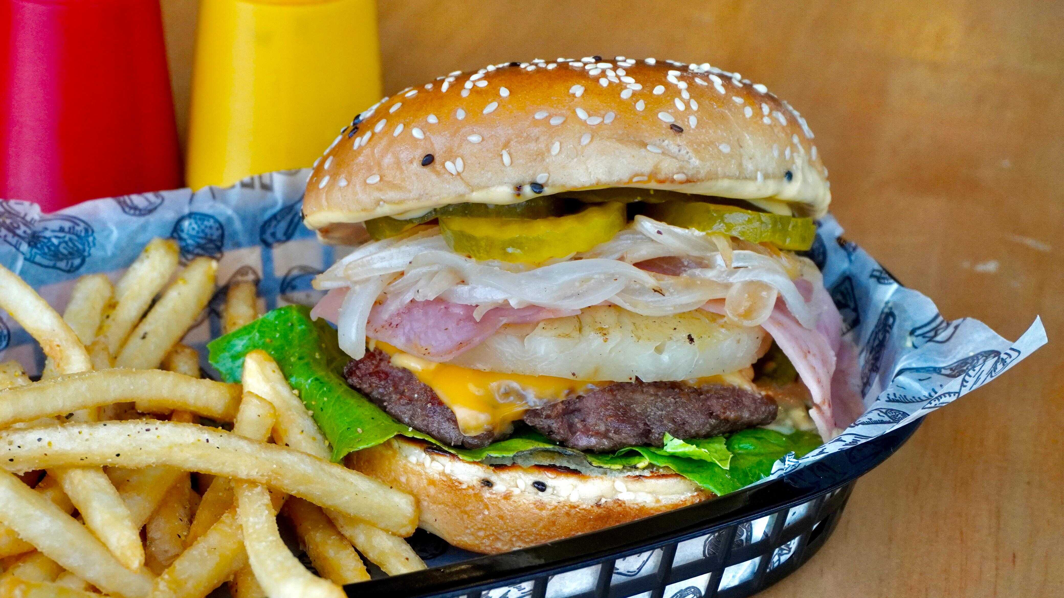 Carne de res, queso gouda, mermelada de tocino, cebolla caramelizada y aderezo de la casa.