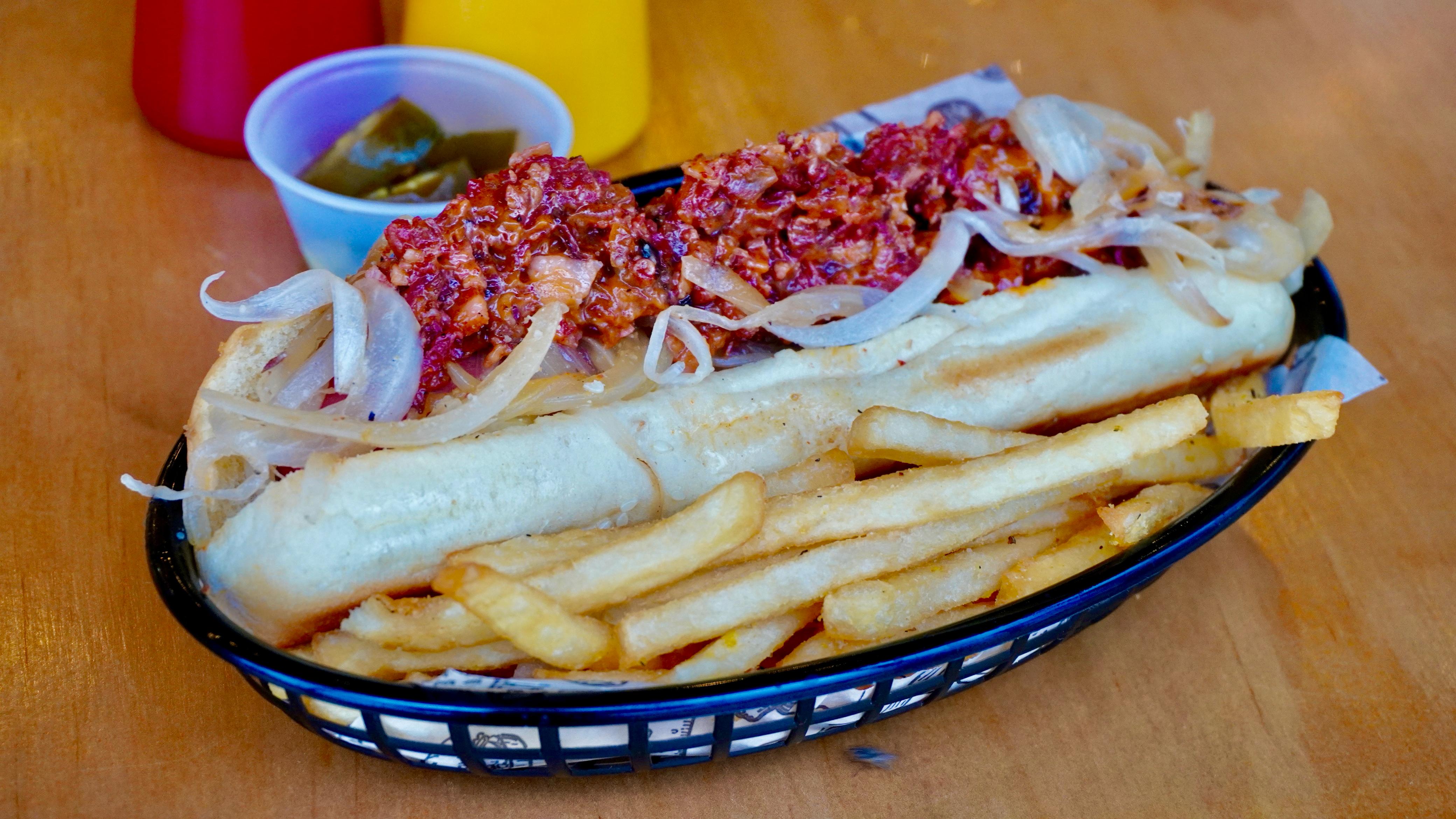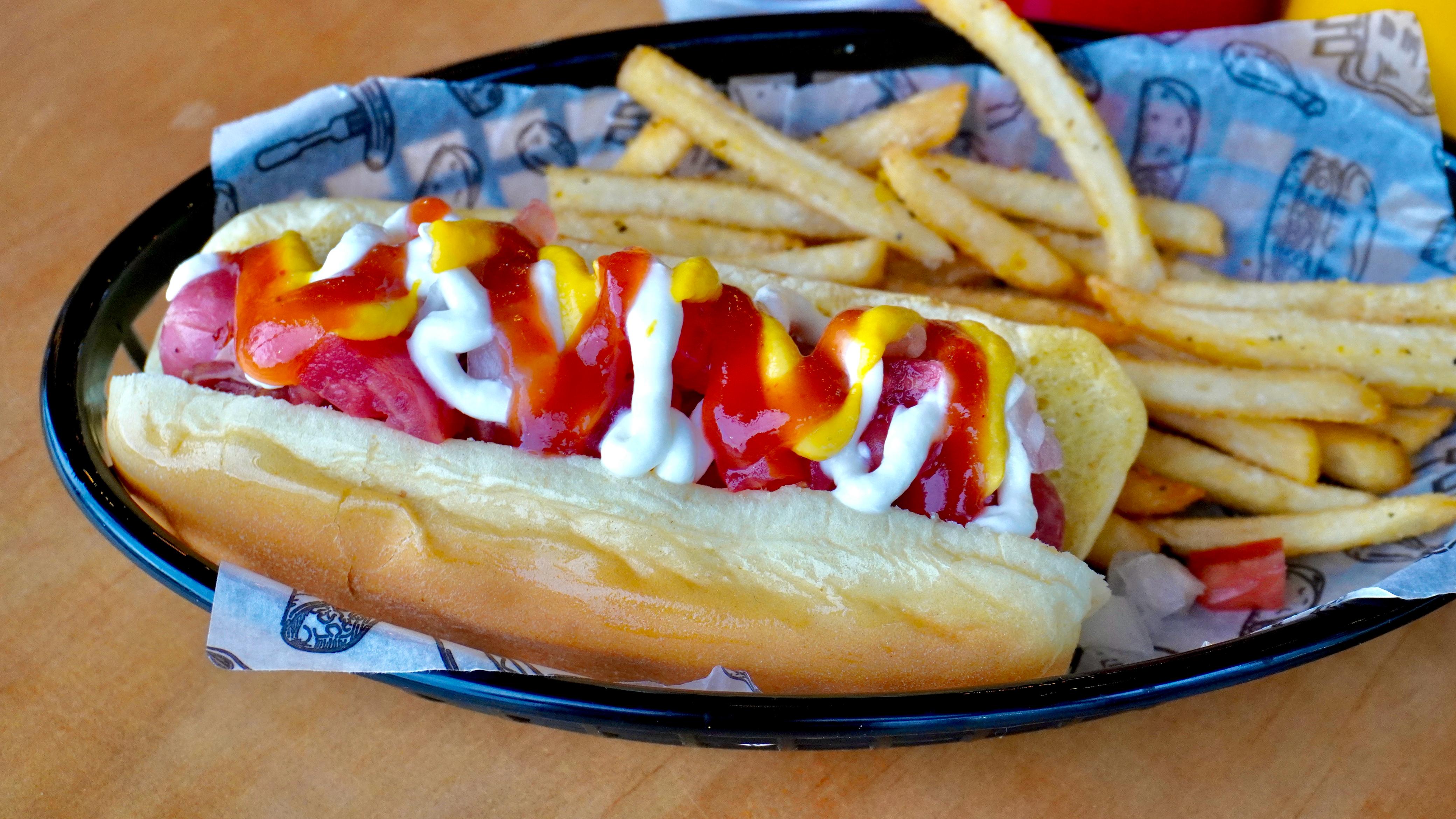Salchicha jumbo bañada con aderezo, mermelada de tocino y papas a la francesa. Sabor único.