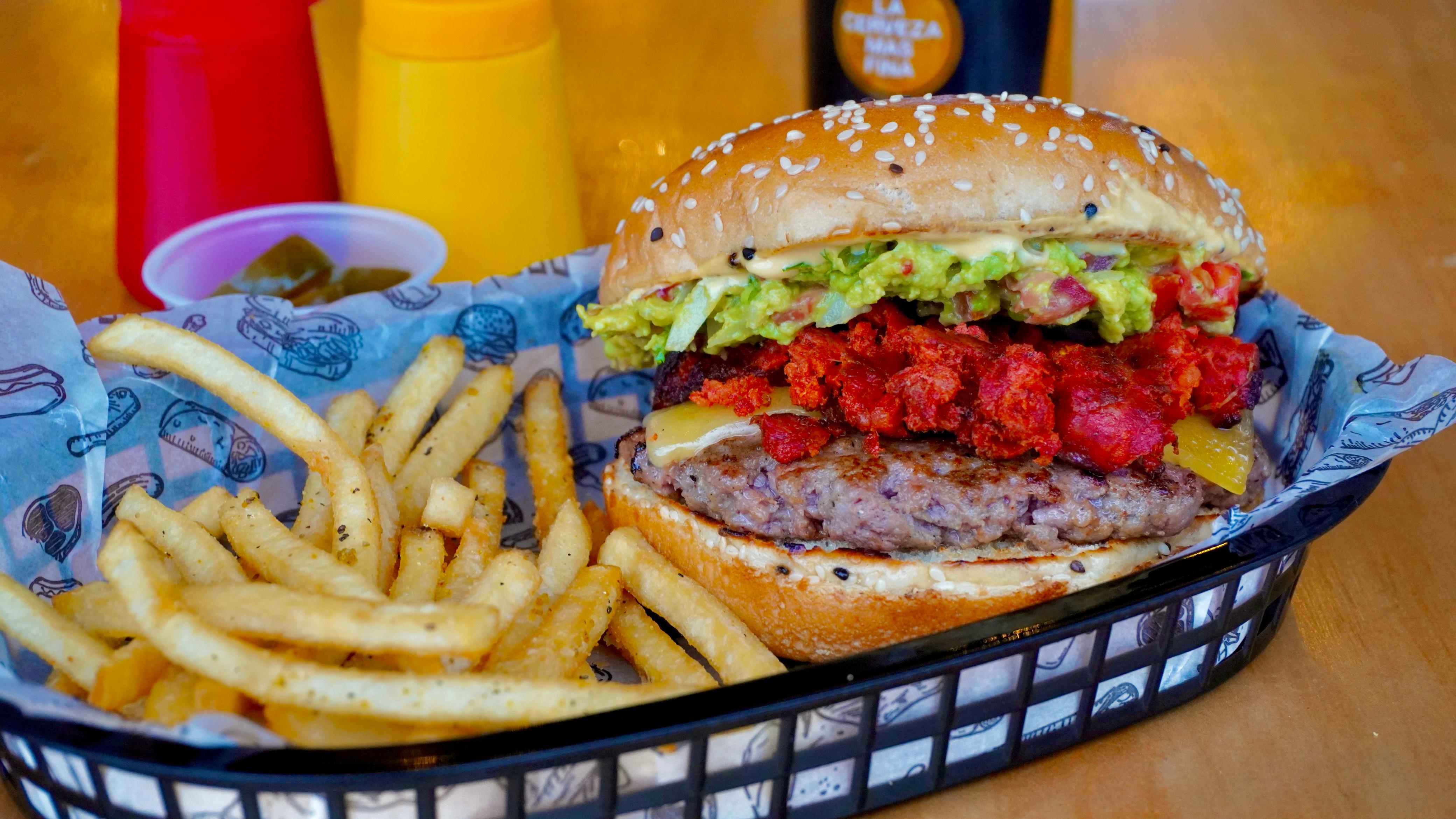 Carne de res con queso gouda, chorizo, exquisito guacamole untado y pico de gallo.