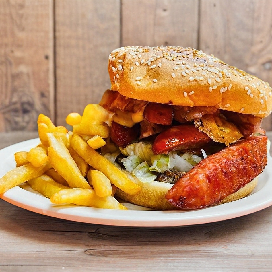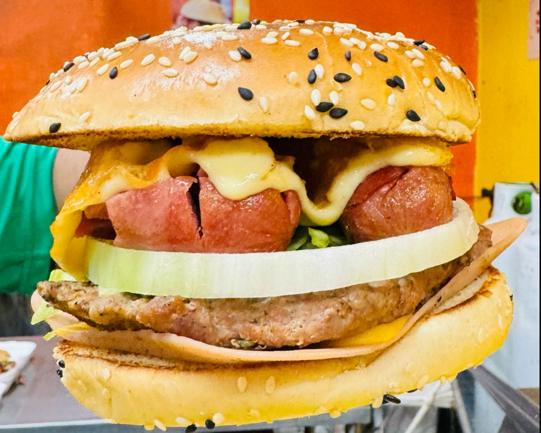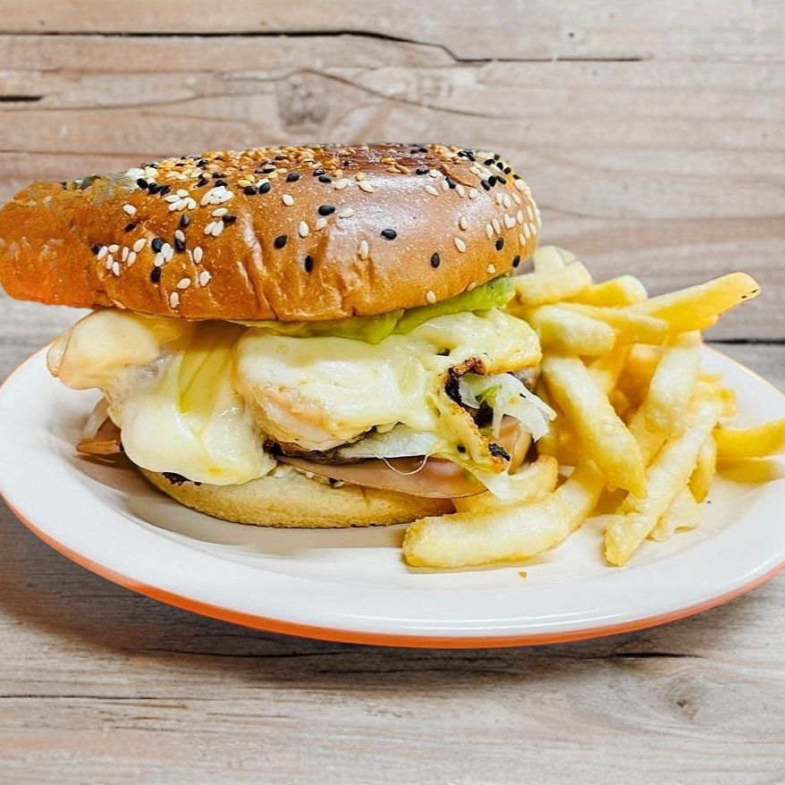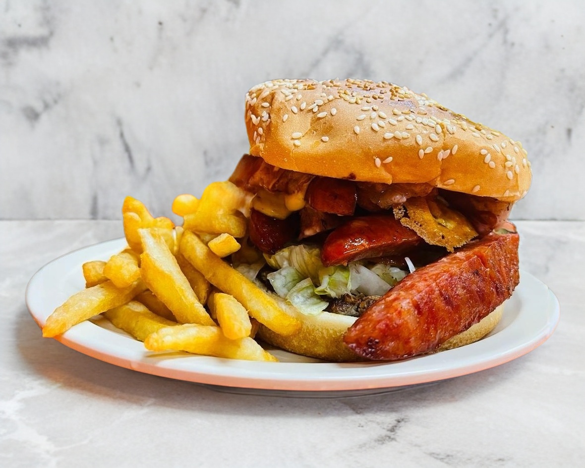 120 gr de Carne para Hamburguesa Jamón, queso amarillo, queso manchego y salchicha. Incluye porción de Papas.