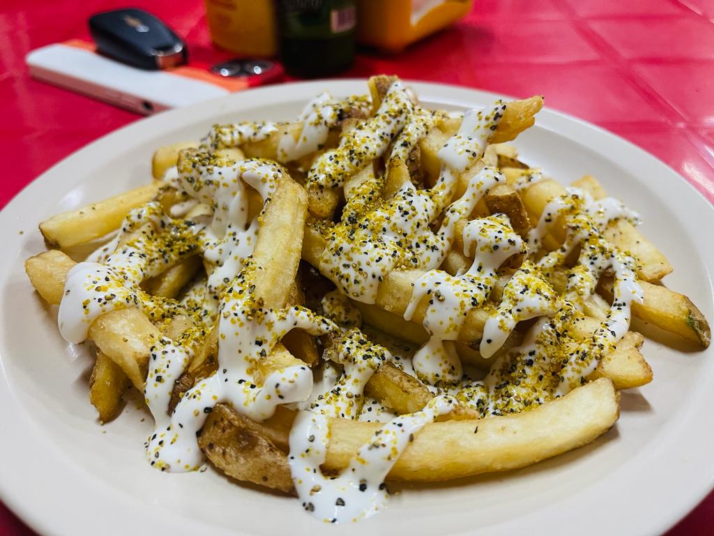 Cuatro quesos, amarillo, manchego, gouda y mozzaella, doble carne, camarones preparados al ajo con mantequilla, tocino y guacamole. Incluye Papas.