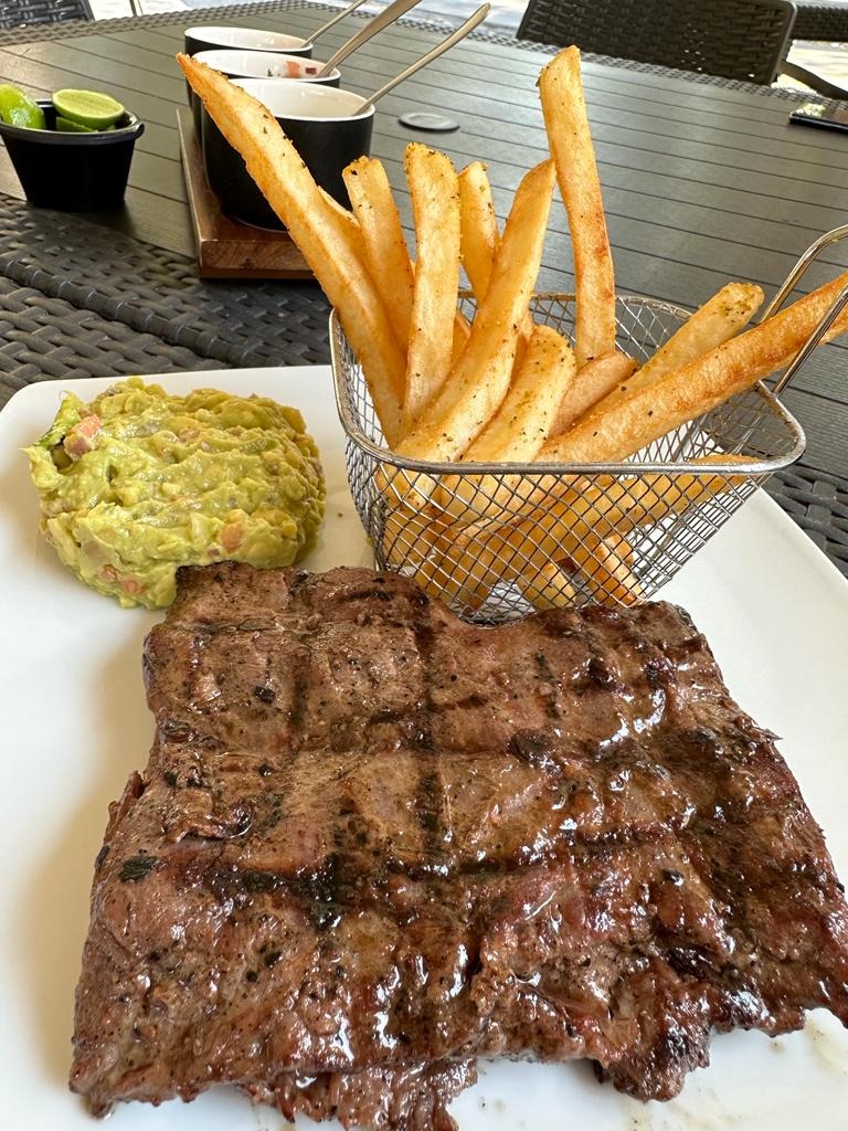 150 gr. de top sirloin, gratinada con queso cheddar, tocino, pan y aderezo de la casa, salchicha asada, guacamole, acompañada de papas y ensalada.