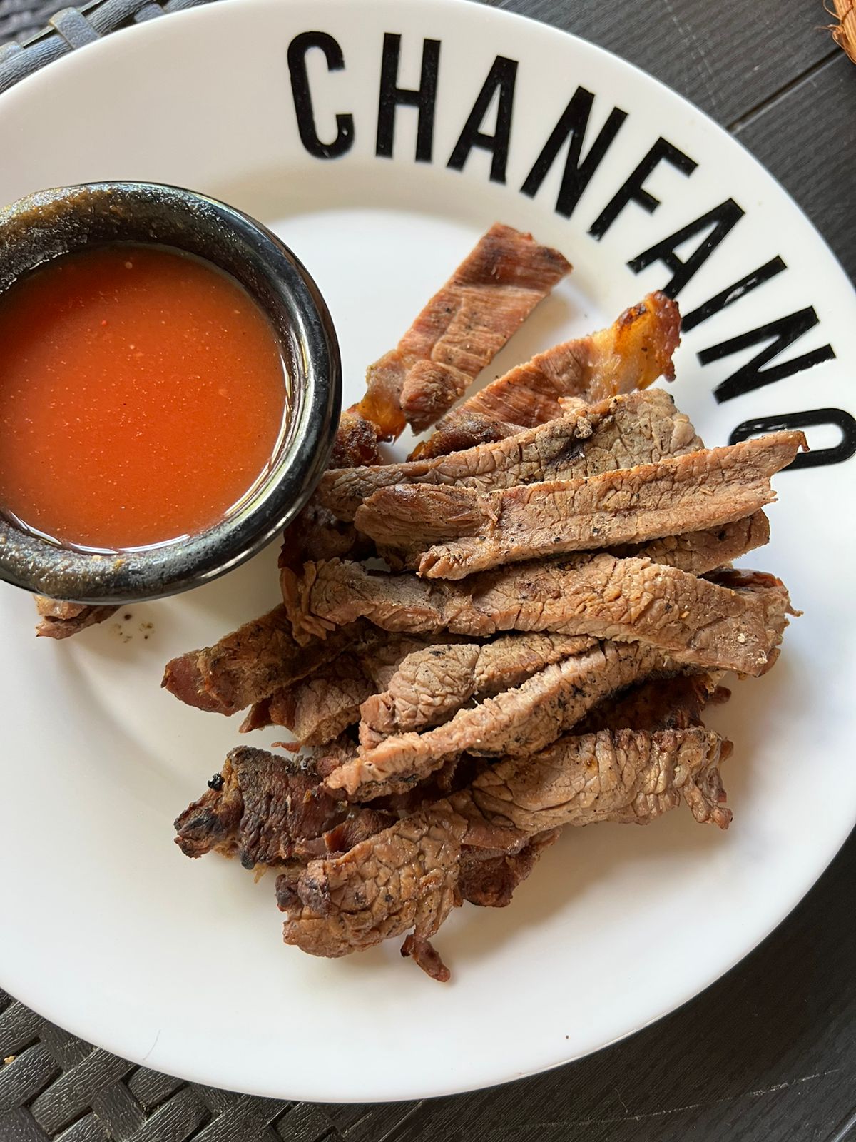 Para los amantes de la carne, 1kg. en crudo de carne marinada estilo chanfaino, con cebollitas, frijoles negros de la olla y juguito chanfaino.