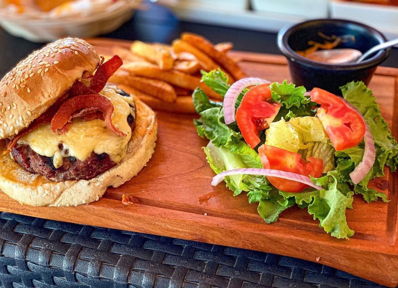 150 gr. de top sirloin, gratinado con queso cheddar, tocino, pan y aderezo de la casa, con guarnición de ensalada y papa a la francesa.