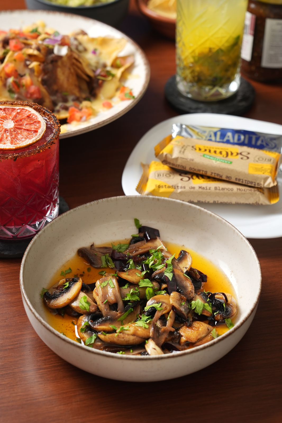 Receta de la casa, champiñones naturales salteados en sartén con chile guajillo y ajo picado.