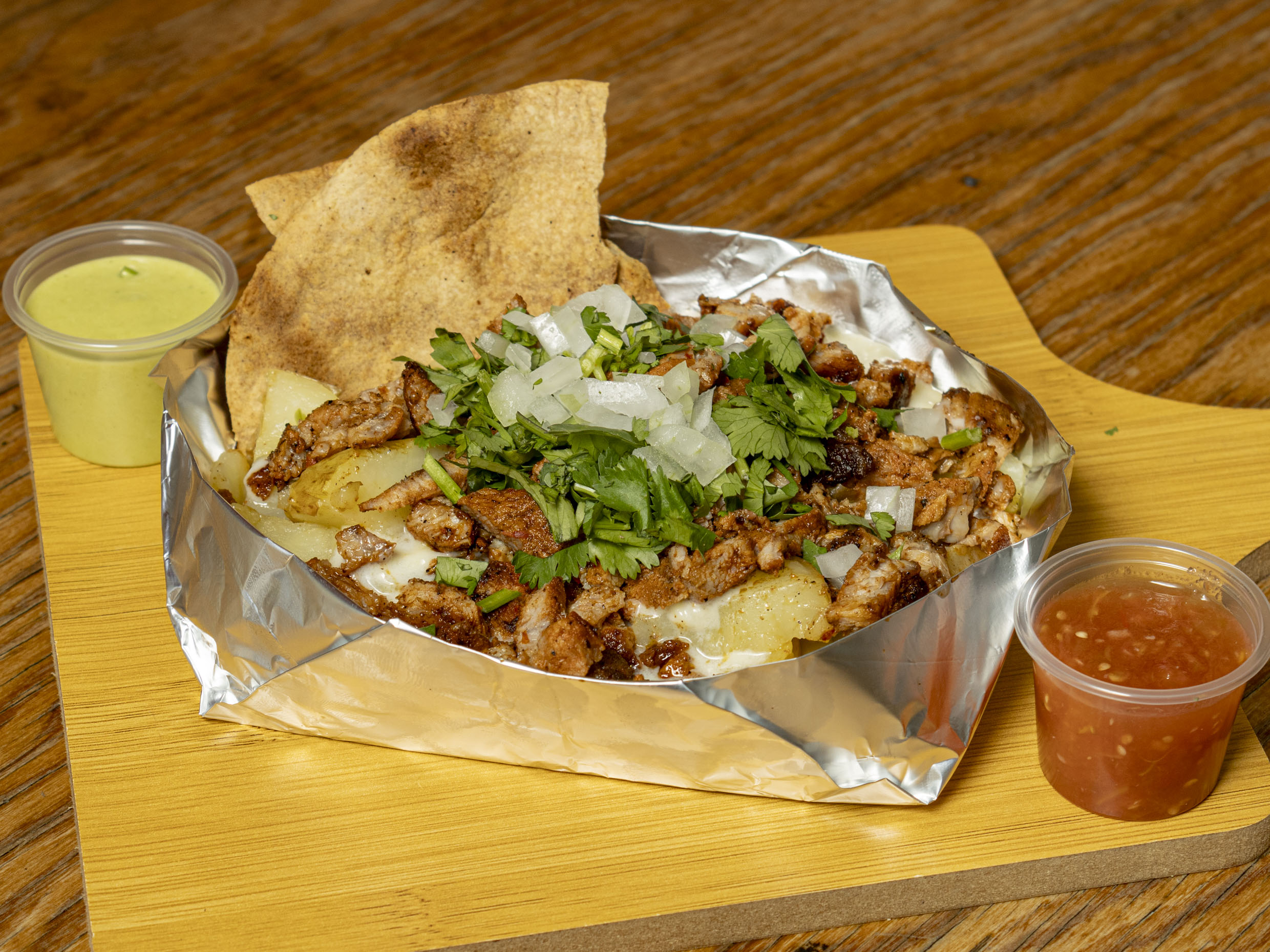 Papa picada, con carne adobada, bañada en queso, cebolla cilantro, doraditas y salsas