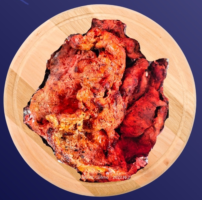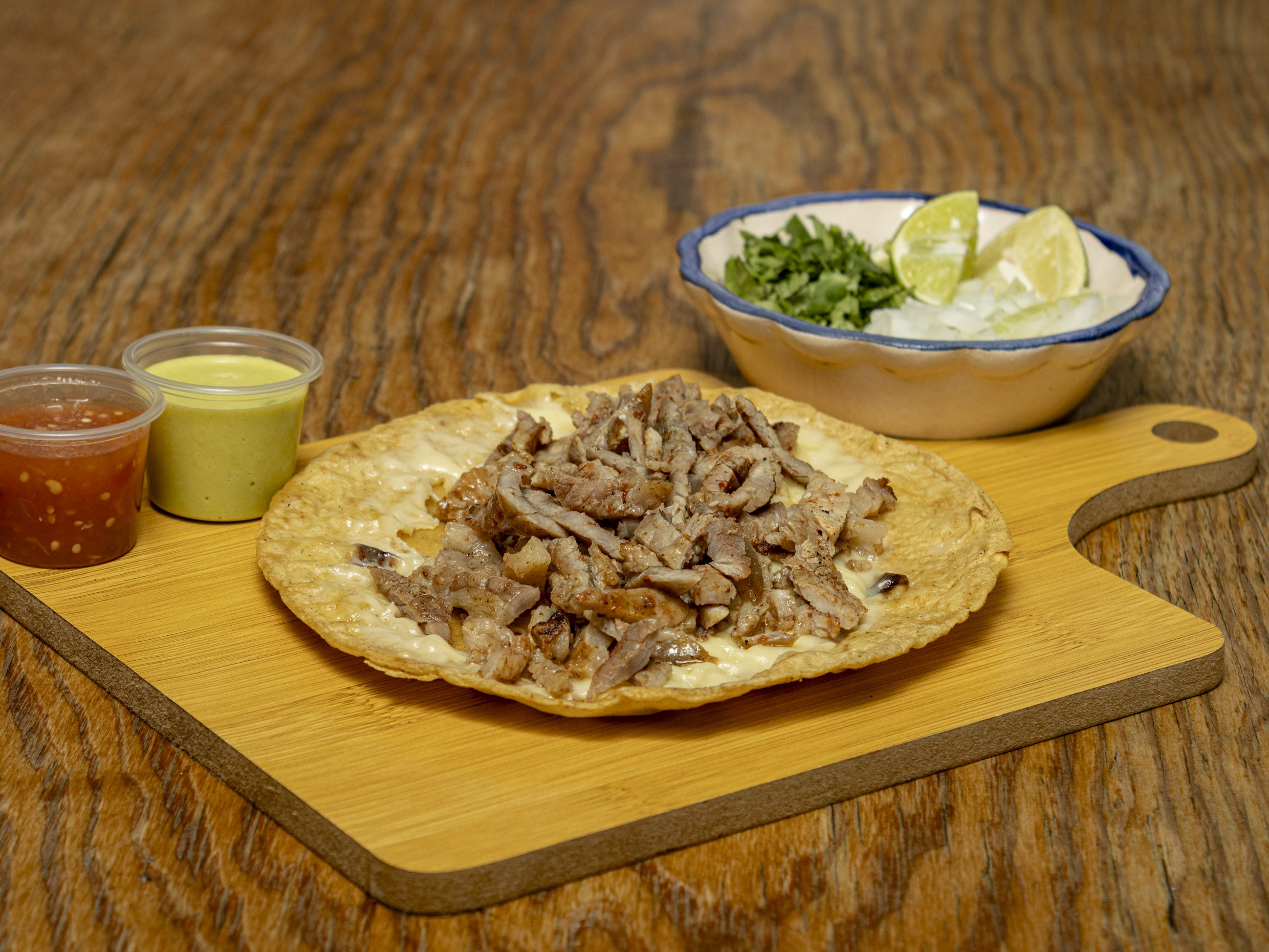 Deliciosa Tocinilla adobada, cebollita asada, chiles toreados, limones,tortillas y salsa