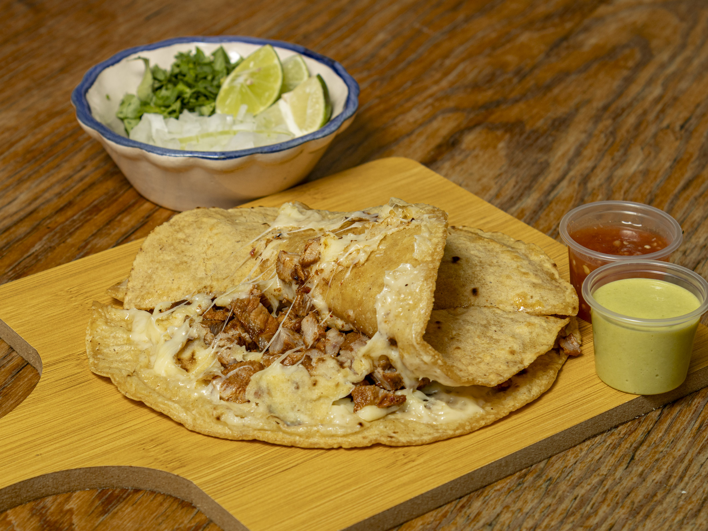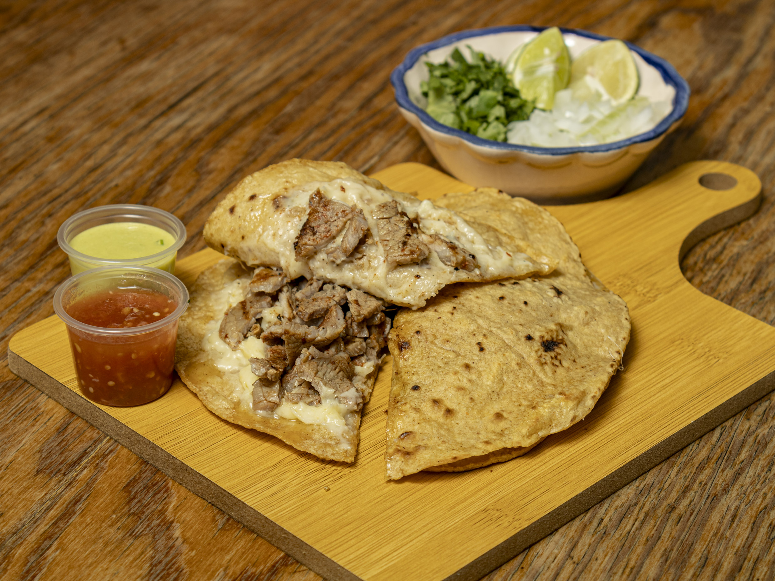 Tortilla echa a mano rellena de carne asada y queso, acompañada de cebolla cilantro y salsas